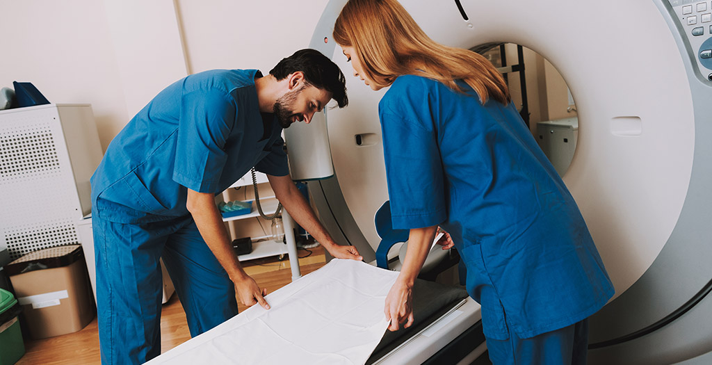 Male and Female Radiology Doctors at CT Machine.