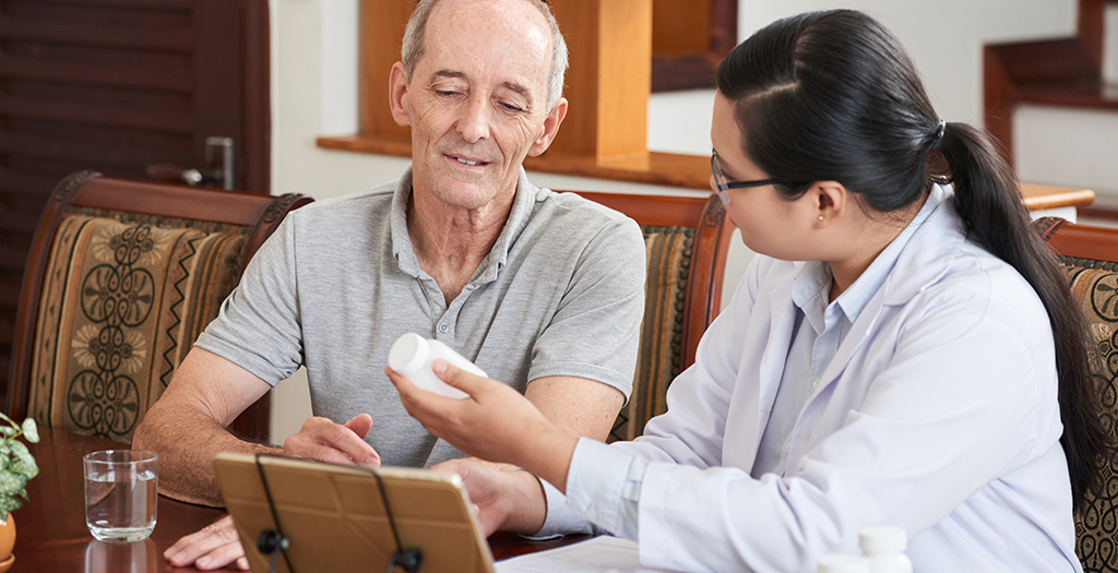 Woman at table with tablet and papers and showing pills in jar to senior patient sitting near